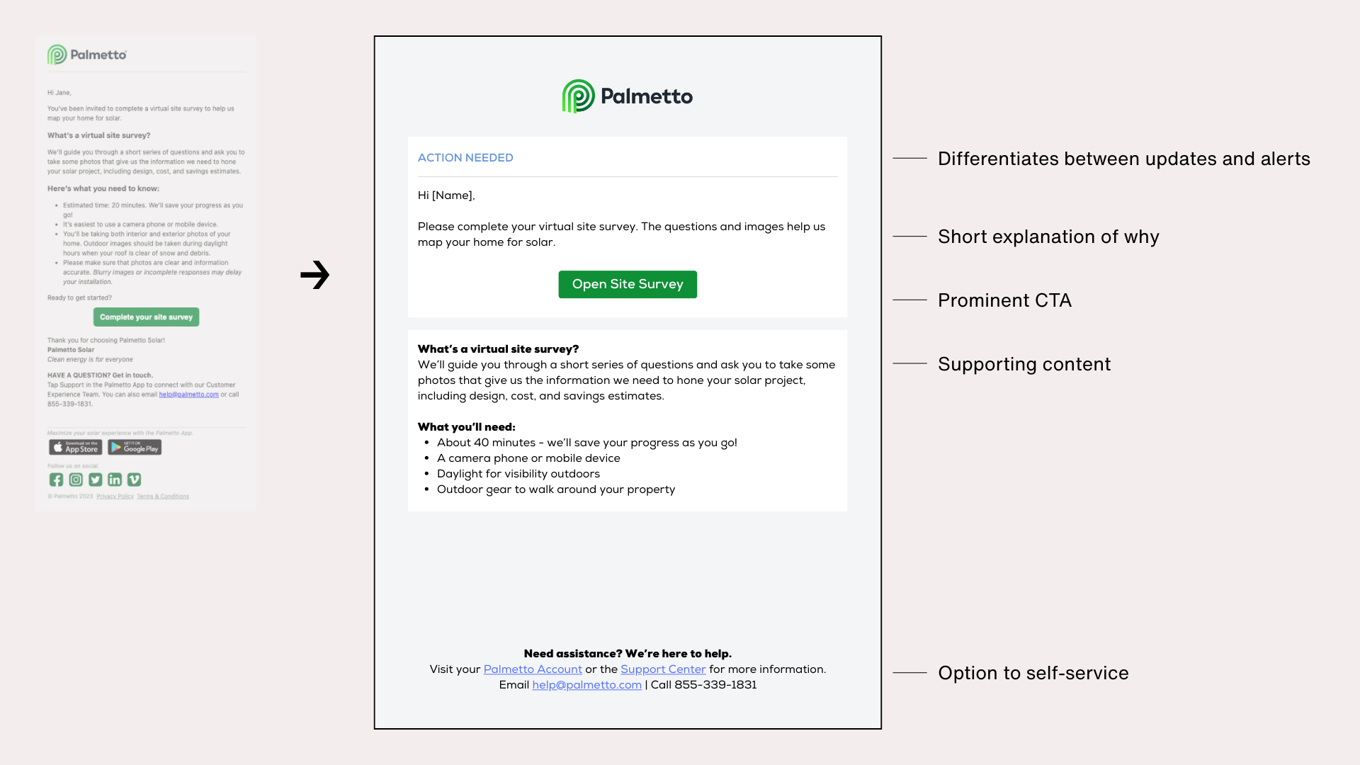 As one of the first self-service features in the sales and installation process, VSS updates helped orient customers to the broader customer journey and empower them to rely on and engage with the Palmetto solar app.